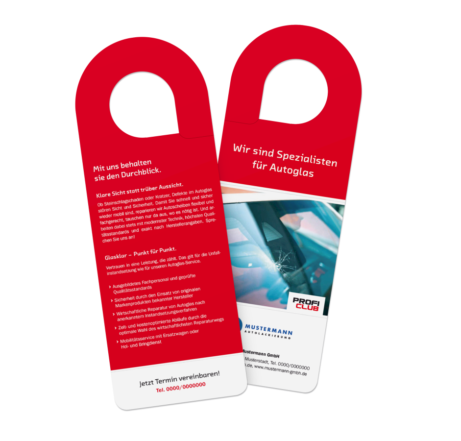 Spiegelanhänger Glas-Reparatur Spiegelanhänger mit Leistungen zur Autoglas-Reparatur. In den Auflagen 250, 500 oder 1.000 Stück erhältlich. Format: 10,2 x 28 cm